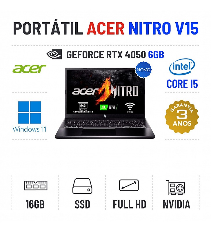 ACER NITRO V15 | 15.6'' FULLHD 144Hz | I5-13420H | 16GB RAM | 480GB SSD | RTX4050 6GB | TECLADO NUMÉRICO1Novo com 3 Anos de Garantia