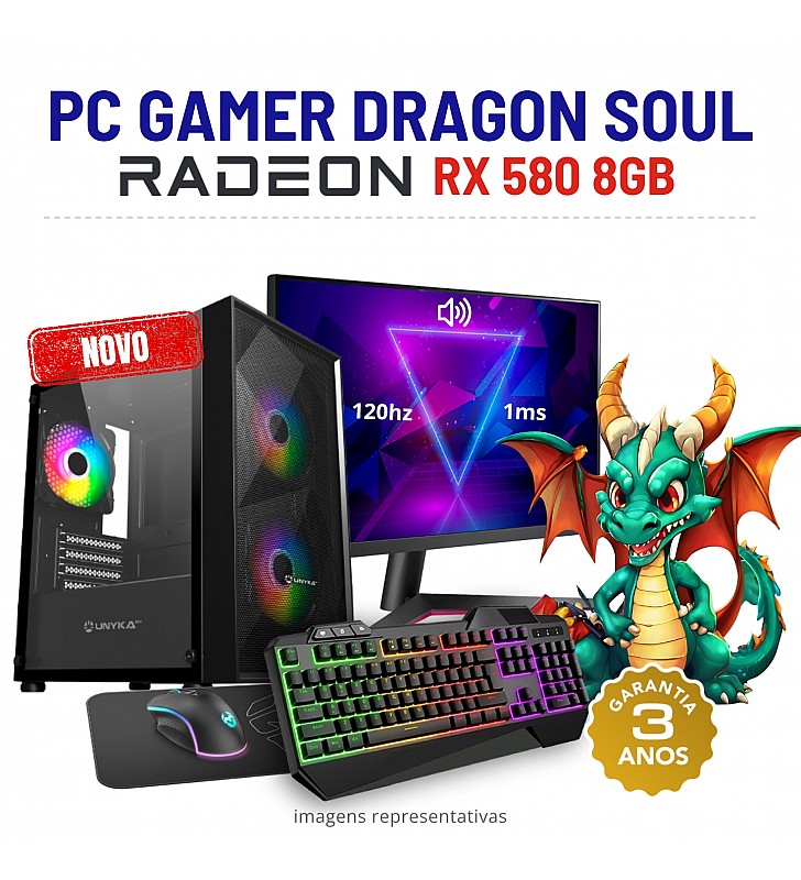 CONJUNTO GAMER DRAGON SOUL | RX580-8GB | RYZEN 3 = i7-7700K | 16GB RAM | 480GB SSD COM MONITOR + ACESSORIOS