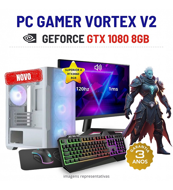 CONJUNTO GAMER VORTEX V2 | GTX1080-8GB SUPERIOR A RTX3060-8GB | RYZEN 5 = i7-10700F | 32GB RAM | 480GB SSD COM MONITOR + ACESSORIOSNovo com 3 Anos de Garantia
