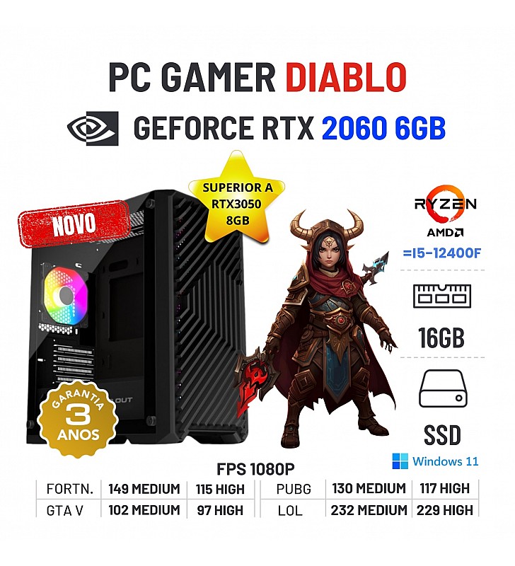 PC GAMER DIABLO NOVO | RTX2060-6GB SUPERIOR A RTX3050-8GB | RYZEN 5 PRO = i5-12400F | 16GB RAM | 480GB SSDNovo com 3 Anos de Garantia