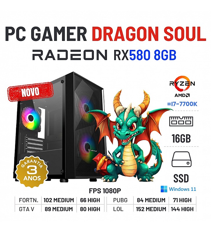 PC GAMER DRAGON SOUL NOVO | RX580-8GB | RYZEN 3 = i7-7700K | 16GB RAM | 480GB SSDNovo com 3 Anos de Garantia